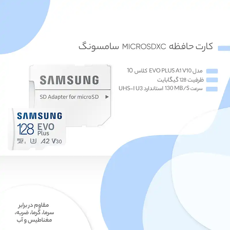 کارت حافظهی 128 گیگابایتی «سامسونگ» از نوع microSD است و البته با انواع لپتاپ، کامپیوتر و دیگر دستگاههای مجهز به درگاه کارت حافظهی SD هم سازگاری خواهد داشت. در بستهبندی این مدل یک آداپتور SD قرار گرفته تا در صورت نیاز بتوانید از آن برای دسترسی به اطلاعات ذخیره شده روی کارت microSD استفاده کنید. شما با استفاده از این آداپتور میتوانید کارت حافظه را بدون نیاز به کارتخوان، به لپتاپ یا کامپیوترتان وصل کرده و به اطلاعات ذخیره شده روی آن دسترسی پیدا کنید. سرعت خواندن اطلاعات در مدل «Evo Plus» از سری محصولات سامسونگ 130 مگابایت برثانیه است. . بنابراین خیالتان راحت باشد که مدل Evo Plus از سری محصولات سامسونگ علاوه بر دوربینهای GoPro با اکثر گوشیهای موبایل، تبلت، دوربینهای ورزشی و دیگر لوازم از این قبیل که درگاه کارت حافظه در آنها microSD باشد، سازگاری خواهد داشت.این کارت حافظهی 128 گیگابایتی میتواند حجم زیادی از اطلاعات، تصاویر و ویدئوهای ثبت شده با دوربینتان را در خود ذخیره کرده و از آنها به خوبی محافظت کند. این مدل در برابر سرما، گرما، ضربه، مغناطیس و آب مقاومت داشته و هیچ آسیبی به اطلاعات وارد نخواهد کرد. استاندارد سرعت در آن UHS-I U3 و کلاس آن هم 10 است. بنابراین باید گفت که این مدل جزو کارتهای حافظهای محسوب میشود که سرعت خواندن و نوشتن اطلاعات در آن مناسب است و به همین دلیل در زمان استفاده از آن هیچ تاثیر سویی در کیفیت تصاویرتان ایجاد نخواهد شد.